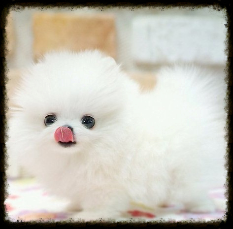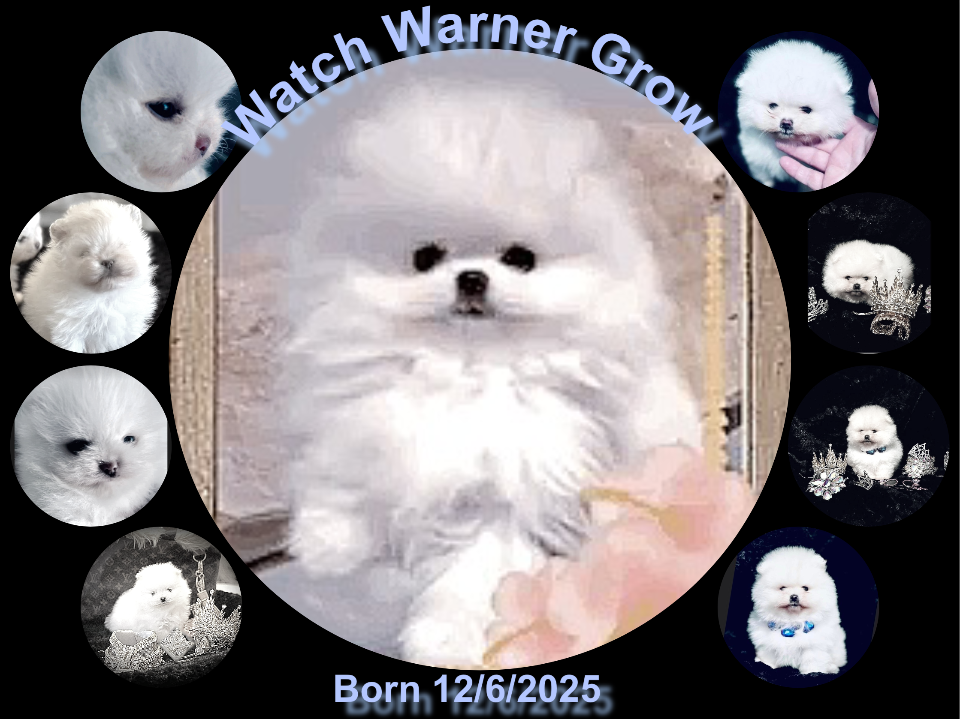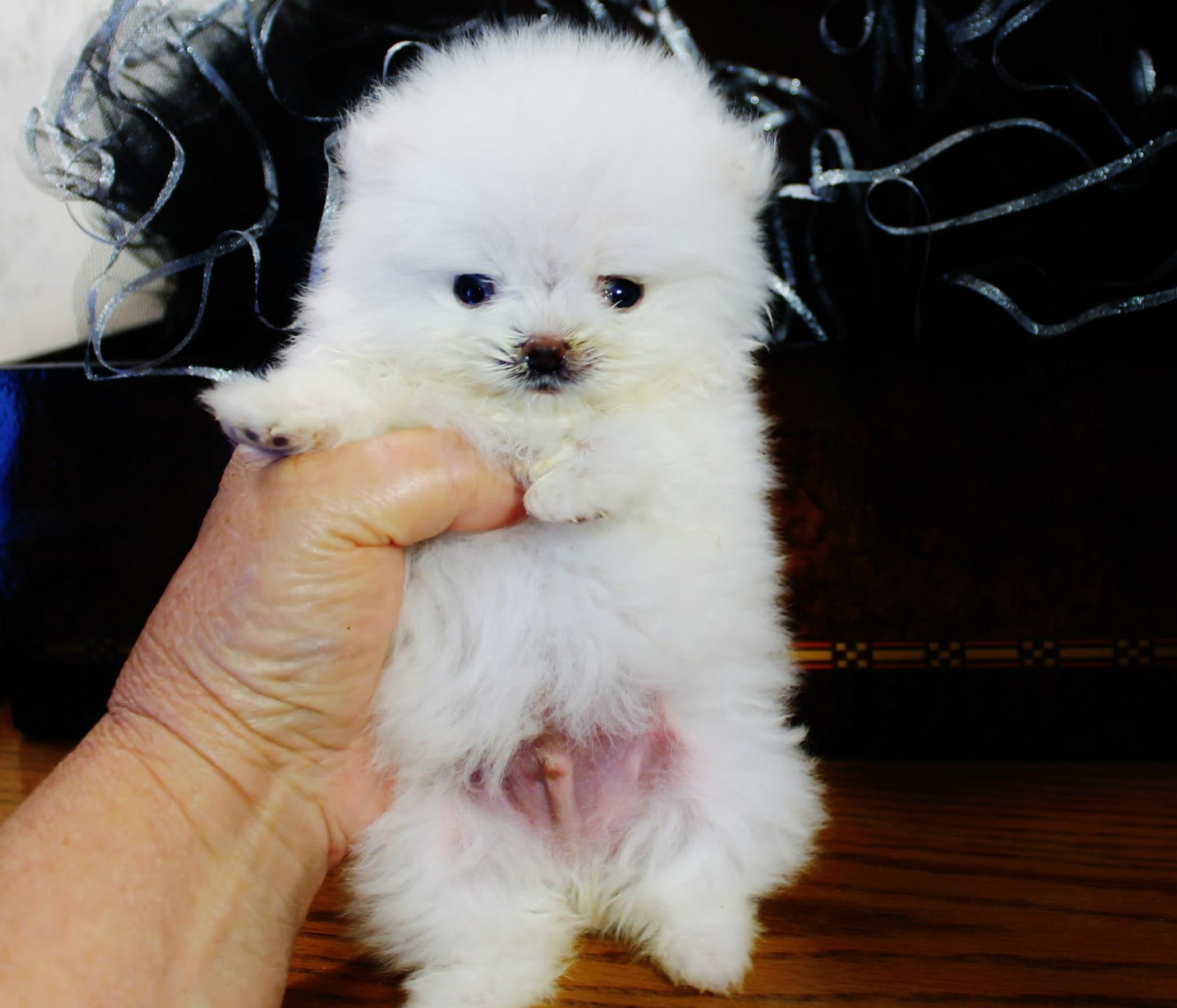 This is Barkley. he is so tiny that when he barks he sounds like a little SQUEAKY TOY ! ! HE IS 9 MONTHS OLD AND STILL WEIGHS ONLY 47 OUNCES !!!HE IS SUPER HEALTHY AND STRONG AND HE COMES WITH A 3 YEAR HEALTH GUARANTEE He is what most people call a MICRO TEACUP POMERANIAN . Technically the American Kennel Club does not recognize that term. So really he is just a super tiny Ice White Pomeranian . We had a DNA panel done on him and he is not only visually ICE WHITE but he is also Genetically Ice White. Genetically he is super rare because he is not only SUPER TINY , HE IS genetically Ice White AND he carries a gene that is responsible for Blue eyes in Pomeranians ( SUPER RARE!) AND HE CAN PRODUCE ICE WHITE PUPPES WITH BLUE EYES ( IF BRED CORRECTLY) and his Genetic health Panel revels that he is NOT GENETICALLY predisposed to any canine diseases
