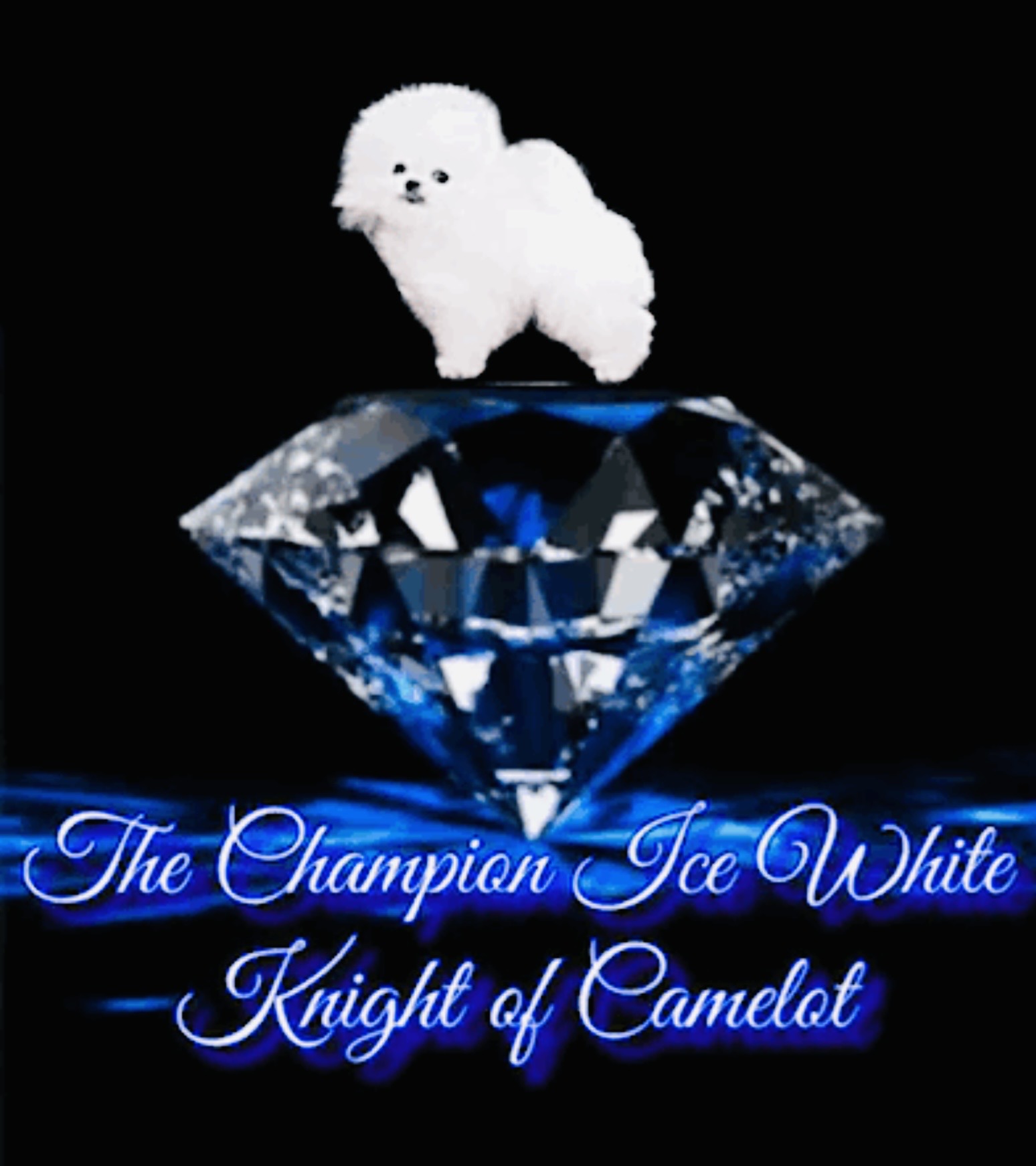 THAT WE DO NOT BREED . BUT WE CAN NOT BEAR TO PART WITH HIM ..AND (3) We also have a one in A MILLION 3 pound ICE White SUPER STUD ( Barkley’s Father ) The Champion Ice White Knight of Camelot , here at our home that has produced ice white puppies with blue eyes , that are super tiny. He is the father of this darling boy Barkley, ( see his Sire Below)