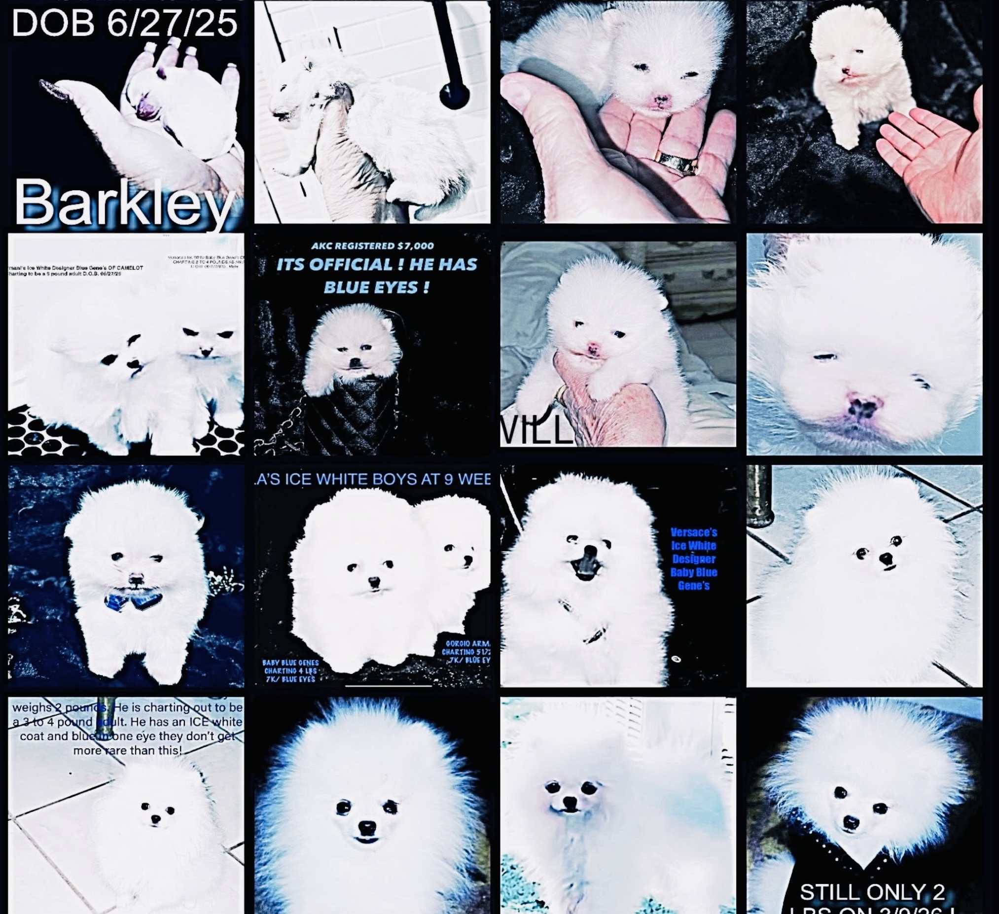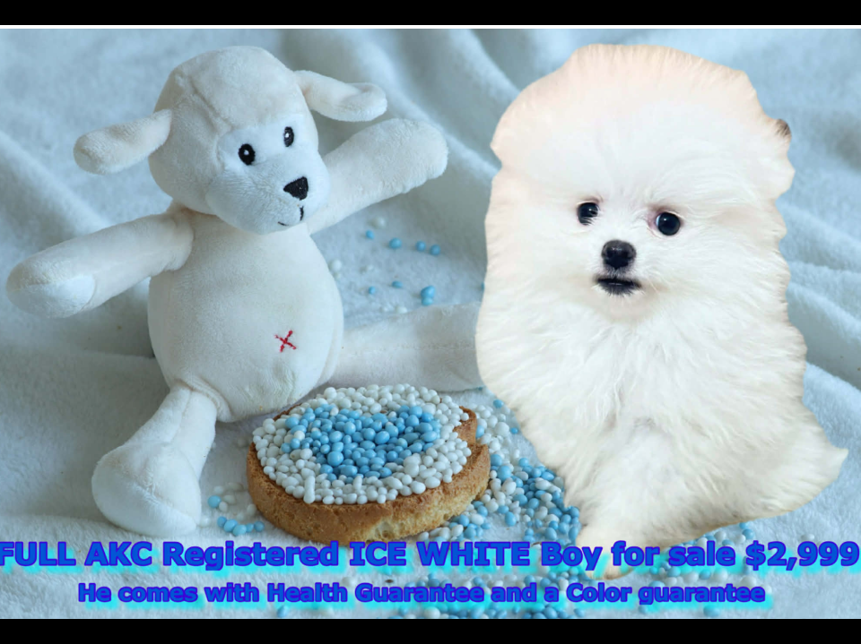 Barkley is so tiny , that when he barks he sounds like a little SQUEAKY TOY ! ! HE IS 9 MONTHS OLD AND STILL WEIGHS ONLY 47 OUNCES !!!HE IS SUPER HEALTHY AND STRONG AND HE COMES WITH A 3 YEAR HEALTH GUARANTEE He is what most people call a MICRO TEACUP POMERANIAN . Technically the American Kennel Club does not recognize that term. So really he is just a super tiny Ice White Pomeranian . We had a DNA panel done on him and he is not only visually ICE WHITE but he is also Genetically Ice White. Genetically he is super rare because he is not only SUPER TINY , HE IS genetically Ice White AND he carries a gene that is responsible for Blue eyes in Pomeranians ( SUPER RARE!) AND HE CAN PRODUCE ICE WHITE PUPPES WITH BLUE EYES ( IF BRED CORRECTLY) and his Genetic health Panel revels that he is NOT GENETICALLY predisposed to any canine diseases