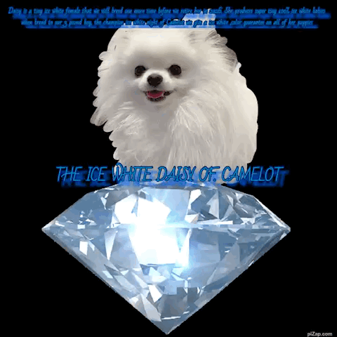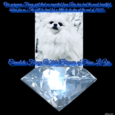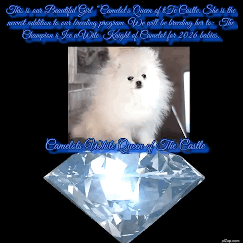 Mila. AKC registered as …. Camelot’s white blue eyed beauty ….I imported her from Europe. She has bright blue eyes and has produced Iced white puppies for me that have beautiful blue eyes. I am keeping one of her female puppies to add to my breeding program. Her name is Coco Chanel’s eyes white designer blue GENES….. She will be bred in 2027 to an ice white blue eyed boy I am importing from South Korea but for the 2026 breeding year, I will only be breeding Mila, Queenie, and maybe Kashmir see all three of them below. All my other breeding females have been placed in forever pet homes. They are being loved, pampered and spoiled.